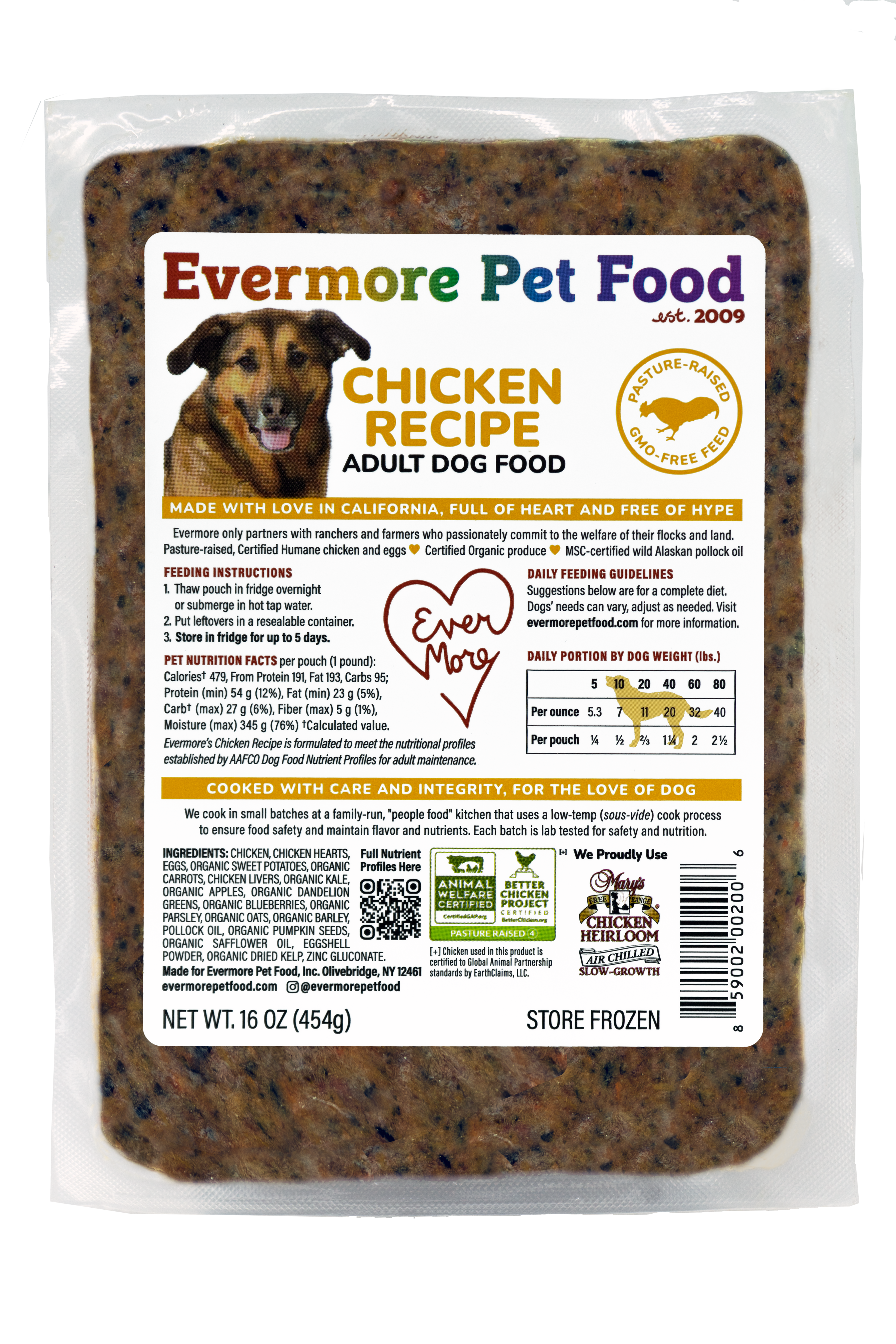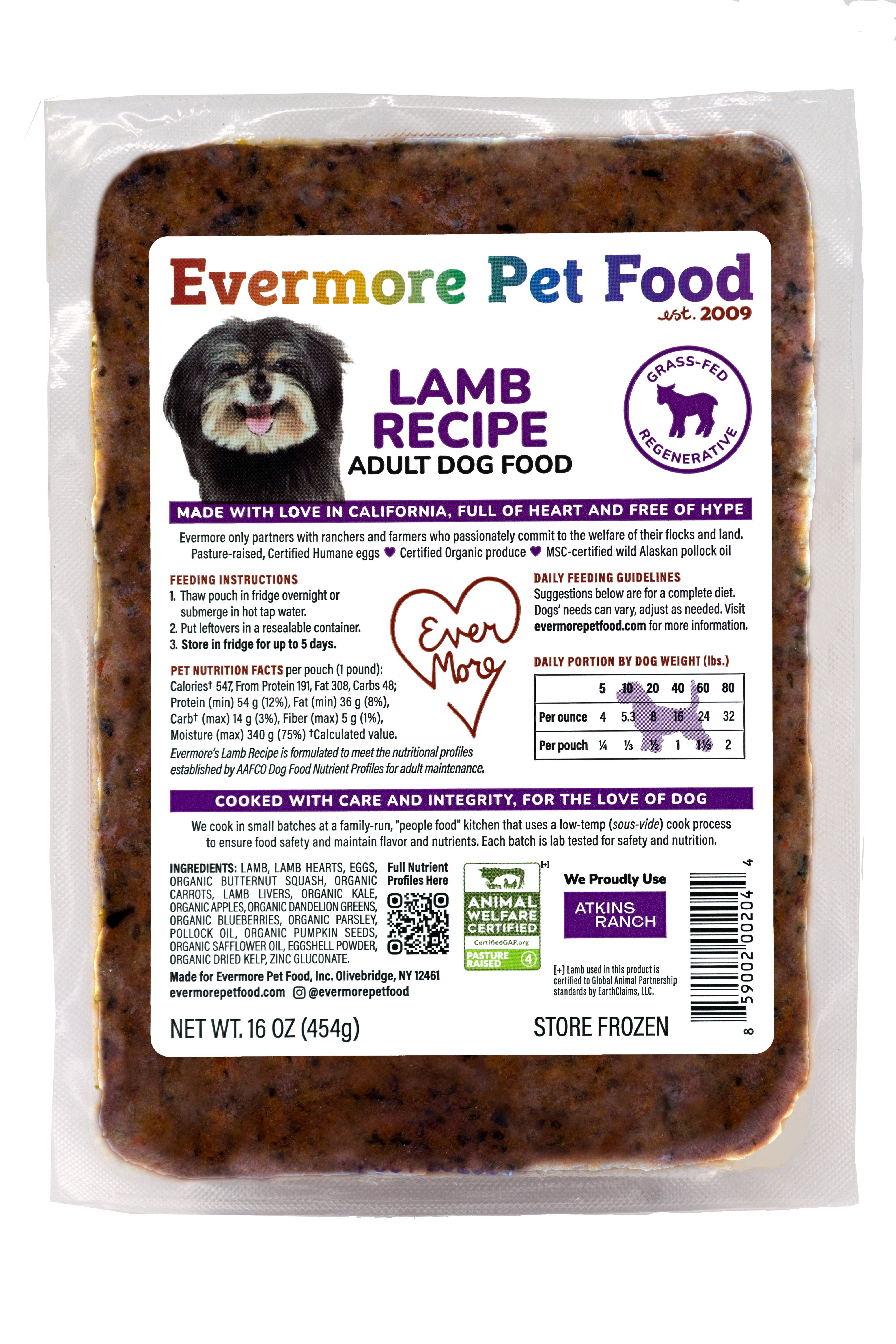 Evermore's approach to eating is based on the idea that a real food diet made up of high-quality, whole-food ingredients is more digestible than processed food, and vitamins and minerals are more easily absorbed by the body. Evermore consists of such a wide array of nutrient-rich foods that we only need to supplement minimally to ensure your pet's diet is complete and balanced.